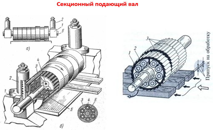 В промышленных рейсмусовых станках часто используется подающий вал, состоящий из секций. Каждая секция подпружинена независимо, что позволяет подавать заготовки с небольшими различиями в толщине (обычно до 2-3 мм). Это значительно увеличивает производительность при обработке узких деталей, так как позволяет подавать следующую заготовку сразу после того, как первая миновала подающий вал.